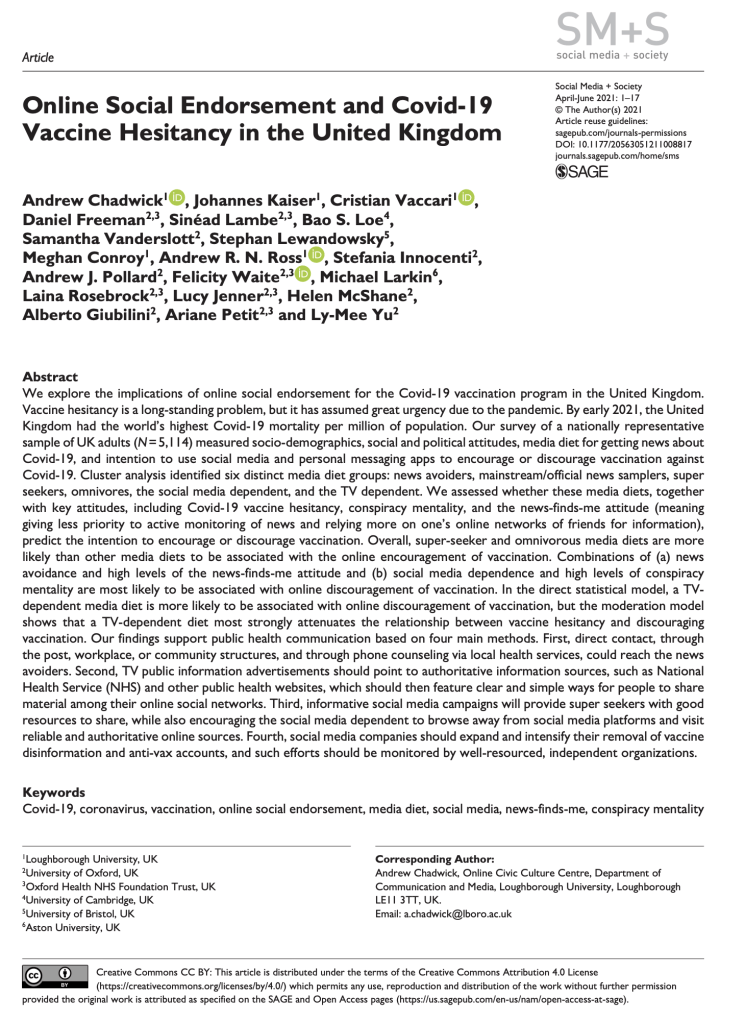 Chadwick, A., Kaiser, J., Vaccari, C., Freeman, D., Lambe, S., Loe, B. S., … Yu, L.-M. (2021). Online Social Endorsement and Covid-19 Vaccine Hesitancy in the United Kingdom. Social Media + Society, 7, 20563051211008816.